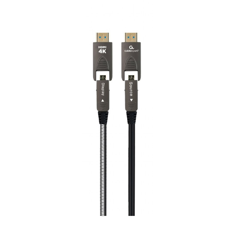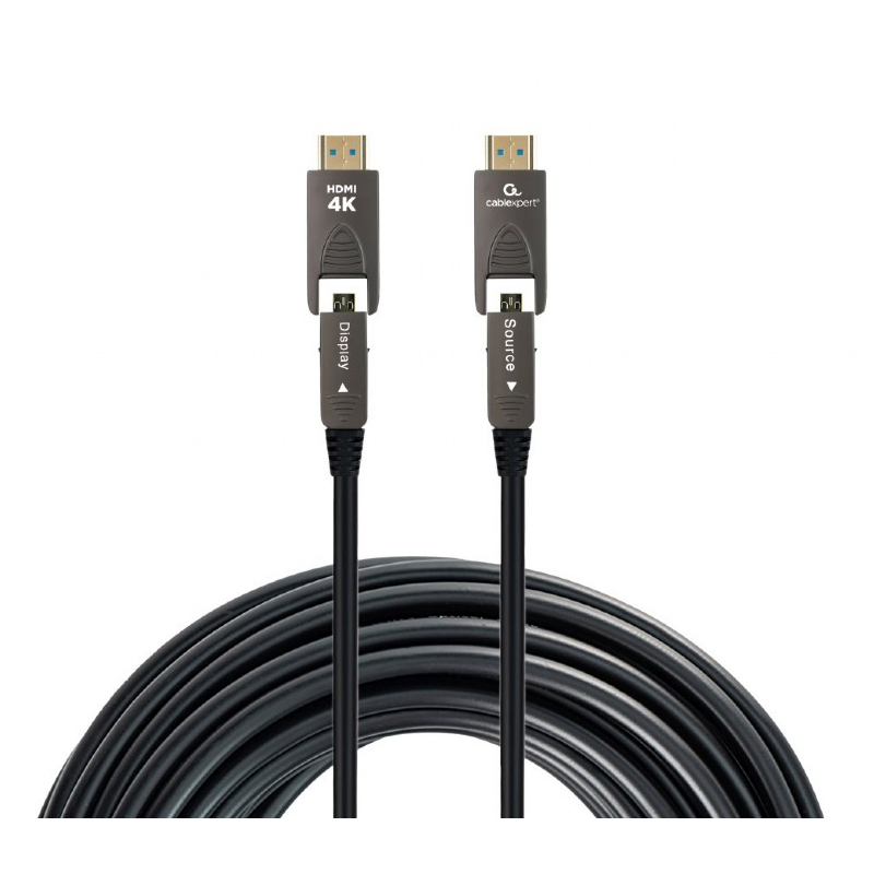 Aktivni optični kabel HDMI D (micro) -A (AOC) 10m uporablja tehnologijo optičnih vlaken za prenos digitalnega signala HDMI. To pomeni, da se lahko signal prenese veliko dlje kot s tradicionalnim bakrenim kablom (do 100 m) in zmanjša tveganje motenj EMI/RFI. Kabli HDMI AOC imajo v notranjosti tudi namenske bakrene napajalne žice, tako da zunanje napajanje ni potrebno. Kabel ima močan oklepni kabelski oplet.