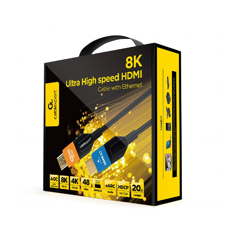Visokohitrostni HDMI AOC kabel 20m z Ethernetom s podporo ločljivosti HDMI 2.1 8K UHD pri 60 Hz. Optični kabel z vzdržljivim najlonskim pletenjem je zelo odporen proti EMI in RFI motnjam. Pozlačeni kovinski konektorji zagotavljajo popolno kakovost slike. Združljiv z vsemi napravami, ki podpirajo HDMI.