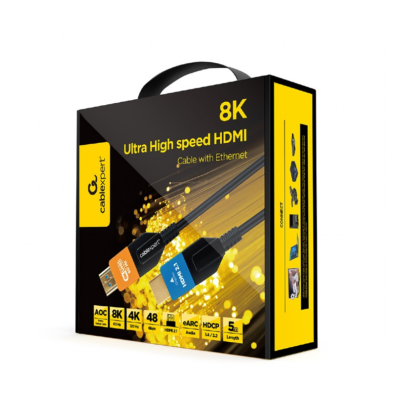 Visokohitrostni HDMI AOC kabel 5m z Ethernetom s podporo ločljivosti HDMI 2.1 8K UHD pri 60 Hz. Optični kabel z vzdržljivim najlonskim pletenjem je zelo odporen proti EMI in RFI motnjam. Pozlačeni kovinski konektorji zagotavljajo popolno kakovost slike. Združljiv z vsemi napravami, ki podpirajo HDMI.