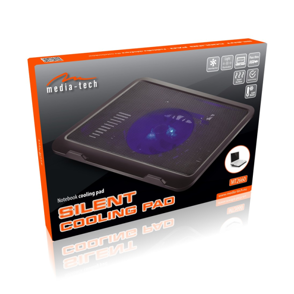 Stojalo za prenosnik MT2660, opremljeno z velikim in tihim ventilatorjem. Idealno za velike igralne in pisarniške prenosnike z velikostjo zaslona do 14 ”.Dodatna prednost so majhne gumjaste varovalke, ki preprečujejo zdrs prenosnega računalnika. Ventilatorji usmerjajo hladen zrak izpod podnožja in ga usmerjajo na dno prenosnika, hkrati pa zagotavljajo zelo nizke emisije hrupa med pretokom zraka.