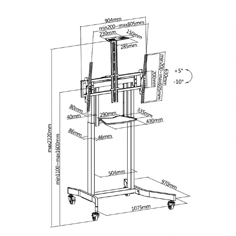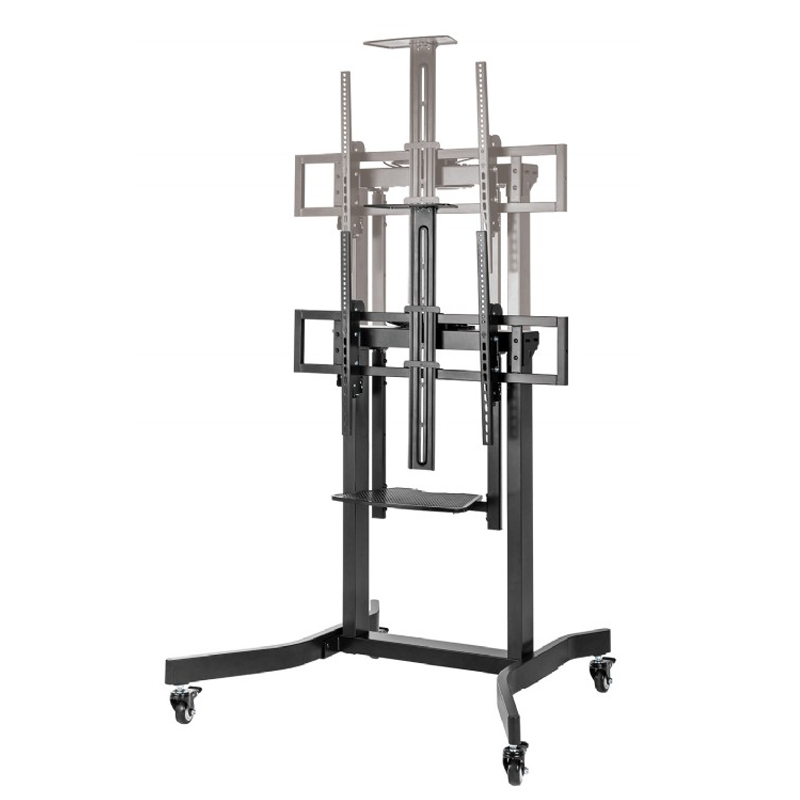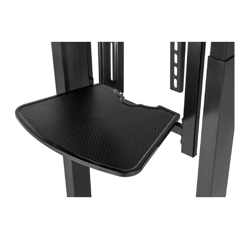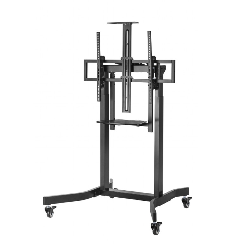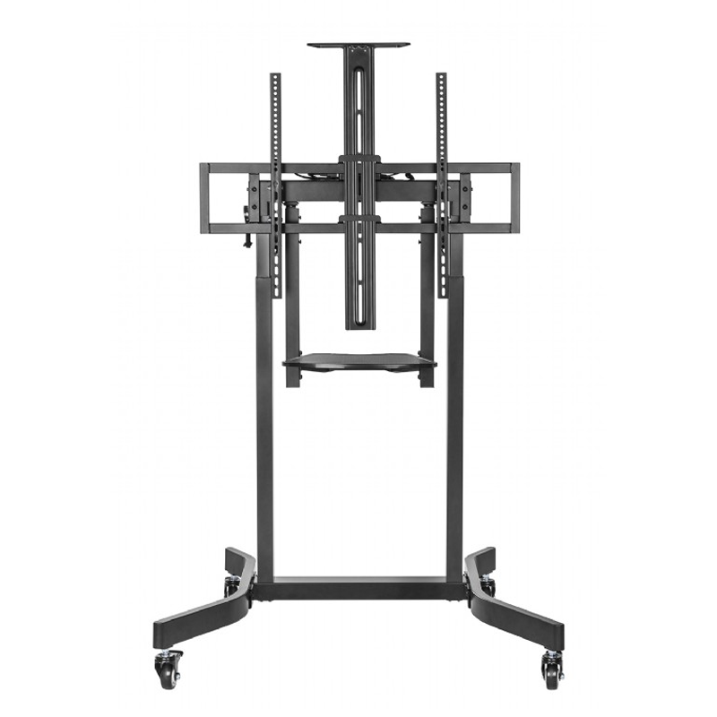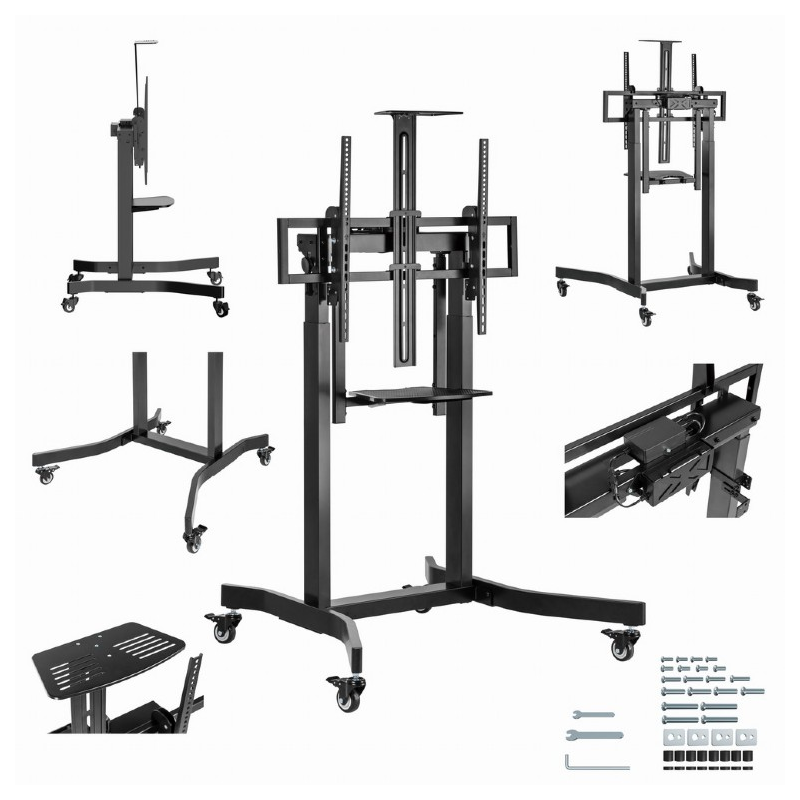 Motorizirano mobilno stojalo Gembird TVS-100T-01 za zaslone 55″ – 100″ ( 140 – 254 cm ), z dvema poličkama za opremo in kamero, obremenitev do 120 kg, za stacionarno ali mobilno uporabo (4 kolesa vključena).