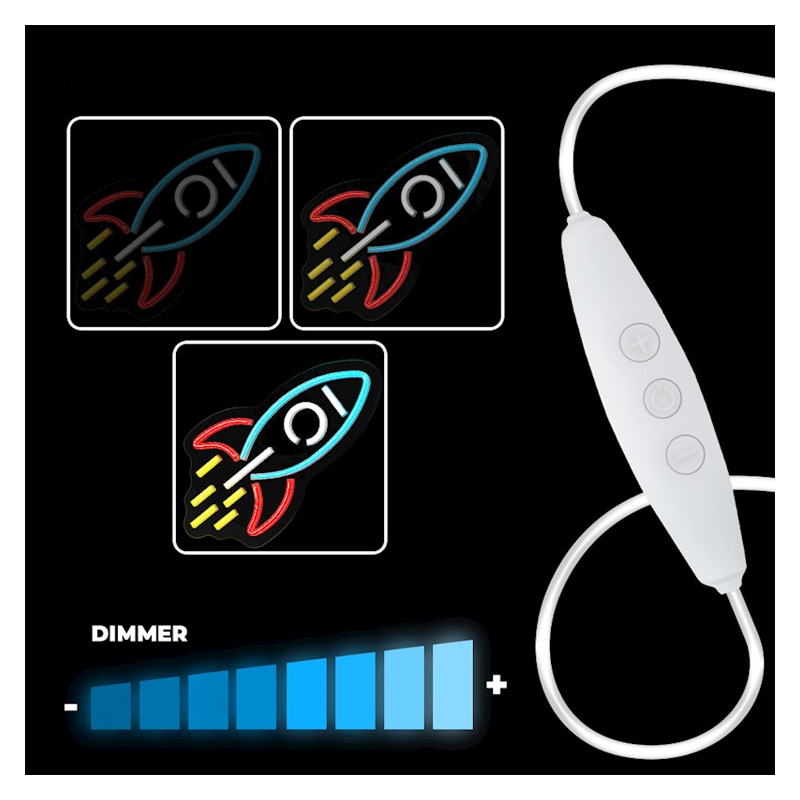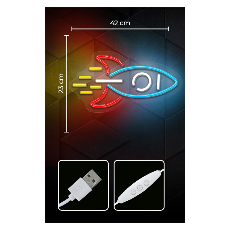 Stenska neonska LED luč v obliki Rakete. Napaja se preko USB priključka.
