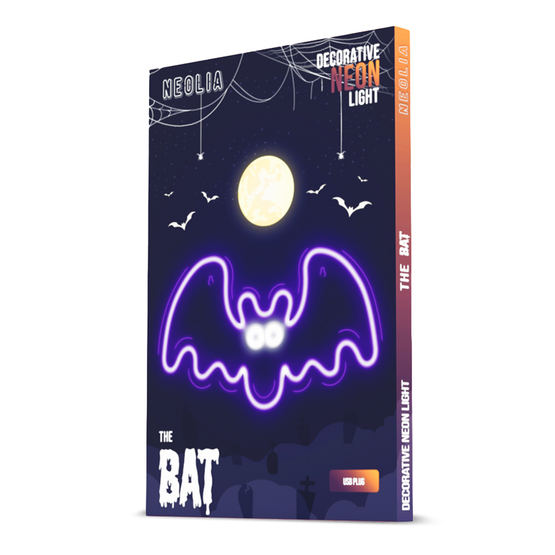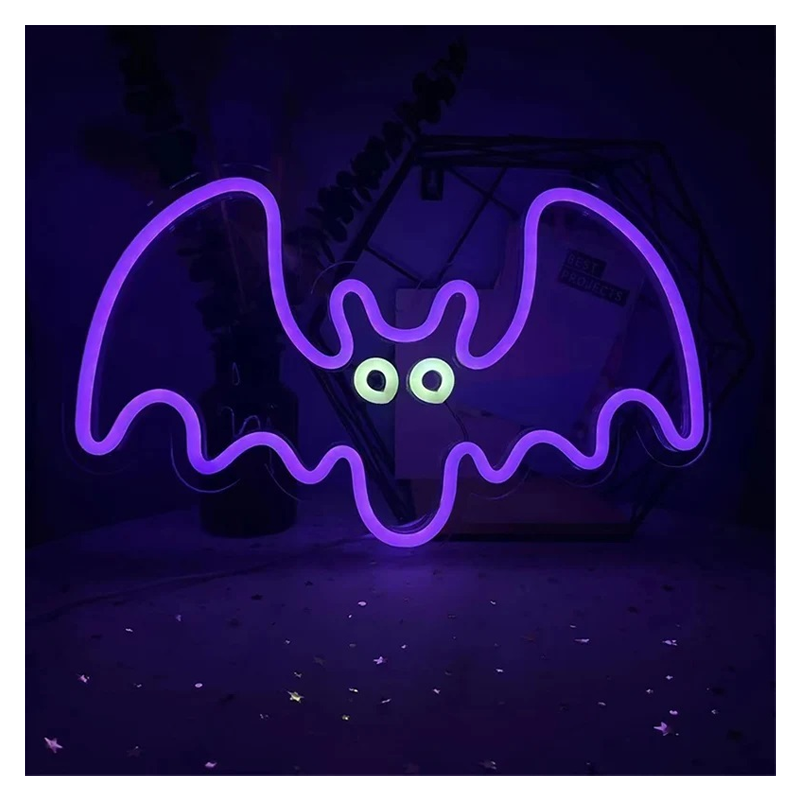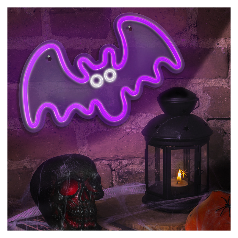Stenska neonska LED luč v obliki netopirja, vijolične barve. Napaja se preko USB priključka.