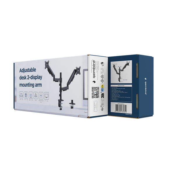 Namizni nosilec za dva monitorja Gembird MA-DA2P-02. Roka se vrti, nagne za spremembo kota branja in omogoča obračanje zaslona iz ležečega v pokončni način.
