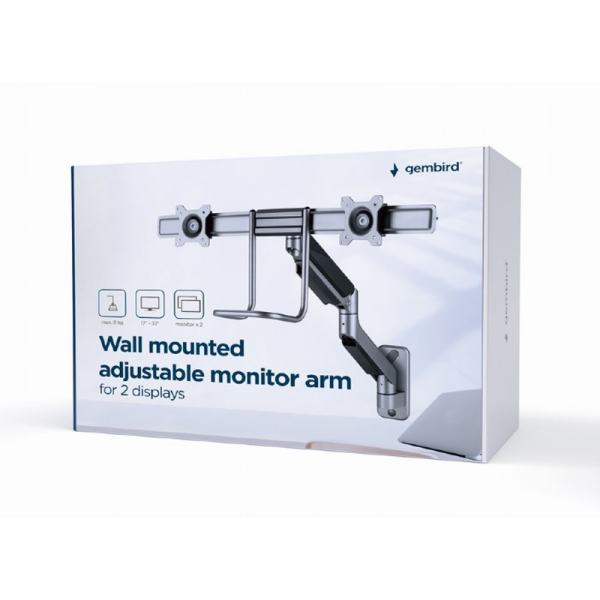 Jekleni stenski nosilec za dva LCD monitorja Gembird MA-WA2-01, primeren za zaslone od 17″ do 32″.