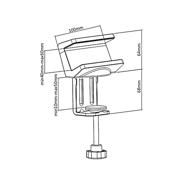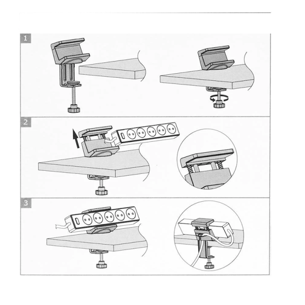 Nosilec Maclean MC-808 lahko pritrdite na vrh mize, mizne plošče itd. z debelino roba od 10 do 55 mm. Izdelek je združljiv z večino razdelilcev širine od 40 do 60 mm. Ušesa na zadnji strani nosilca olajšajo organizacijo kablov povezanih naprav.