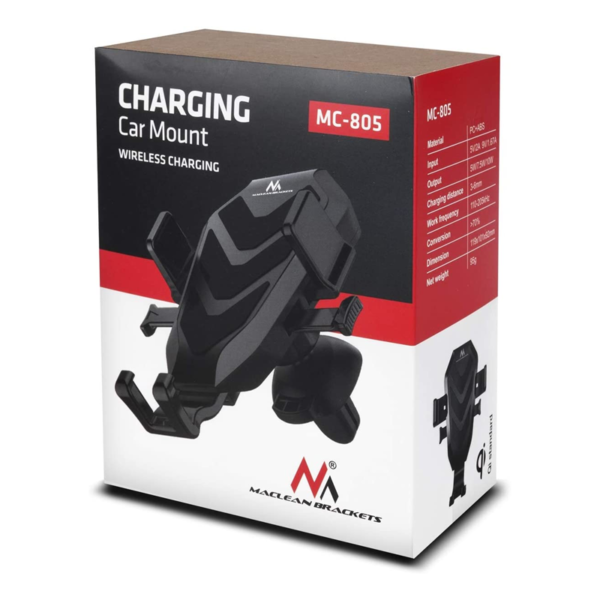 Qi Maclean MC-805, Qualcomm QC 3.0, brezžični, USB-C polnilec – sodobno in popolnoma funkcionalno držalo za telefon, opremljeno s tehnologijo brezžičnega polnjenja Qi, zahvaljujoč kateremu lahko v načinu hitrega polnjenja Qualcomm QC 3.0 svoj pametni telefon polnite brez priključnih kablov. Uporaba ročaja je zelo preprosta in praktična – ima avtomatski in trpežen vpenjalni mehanizem. Vrtljivi nosilec omogoča nastavitev ročaja v poljubnem položaju. Ročaj je bil dodatno opremljen z režo za dišeči vložek (vložke je treba namestiti na določeno mesto).