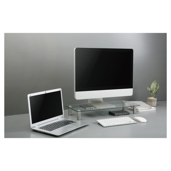 Stojalo za monitor/prenosnik iz kaljenega stekla Gembird MS-TABLE-GM-01. Višinsko nastavljive noge za optimalno postavitev in kot gledanja.
