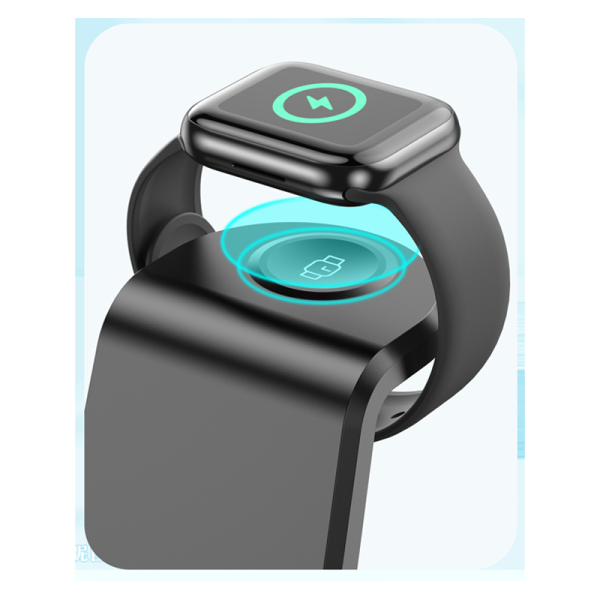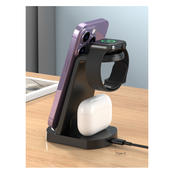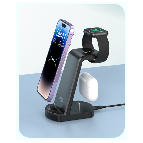 XO WX035 3v1 je stojalo z Lightning priključki za polnjenje pametnih telefonov in bluetooth slušalk z dodatnim induktivnim polnilnikom, kompatibilnim z Apple Watch. Zaradi tega je popoln za uporabo doma ali v pisarni.