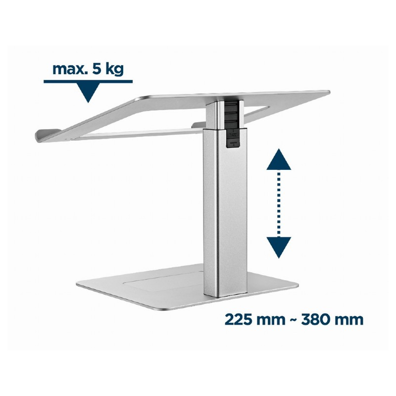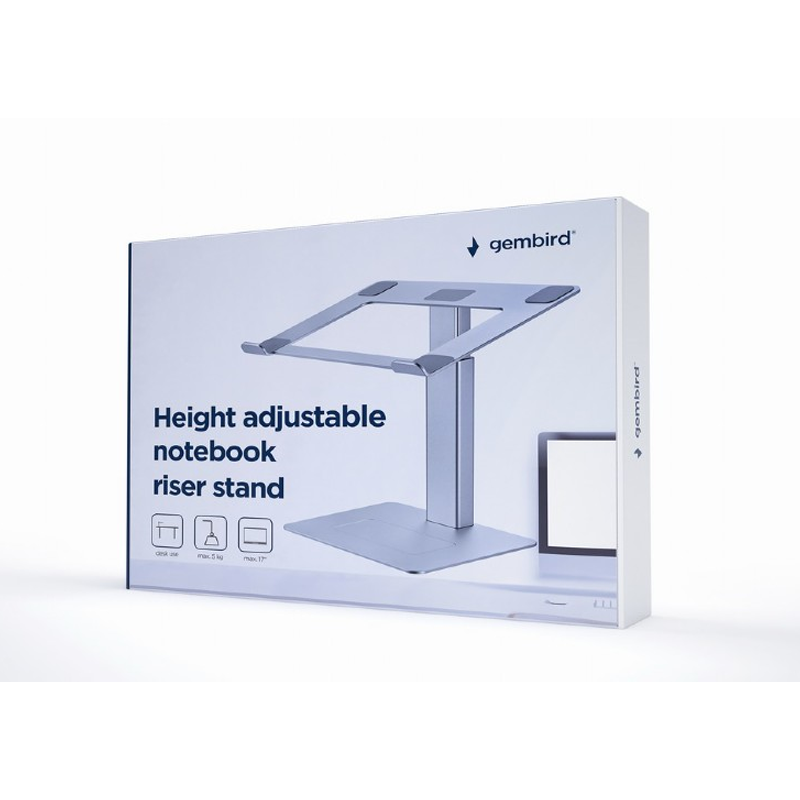 Stojalo za prenosnik Gembird NBS-D1-02, eleganten dizajn iz aluminija se odlično prilega vsakemu prostoru. Za prenosnike 11″ – 17″ (28 – 43 cm), obremenitve do 5 kg, nastavljiva višina.