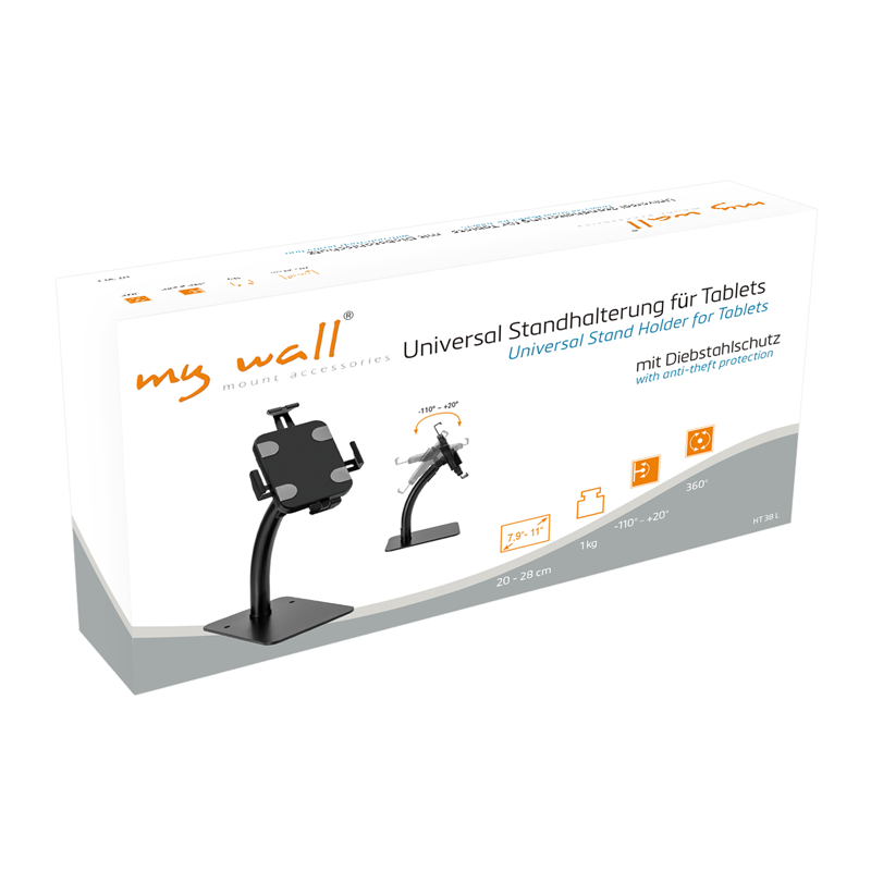 Visokokakovostno stojalo za tablico MyWall HT 38L, ki ga lahko namestite na mizo ali pritrdite na steno. Tablico lahko postavite vodoravno ali navpično. Zaradi svojih funkcionalnih lastnosti je idealno za uporabo povsod, kjer je potreben dostop do interaktivnega informacijskega okolja – deluje lahko kot elektronski informator, multimedijski prezenter, virtualni anketar, virtualni prezentor zemljevidov in vodnikov, virtualni svetovalec in prodajalec. Estetski videz stojala se odlično poda v različne vrste interierjev, vključno s prodajnimi mesti, recepcijami, sejemskimi stojnicami in razstavnimi prostori. Stojalo je združljivo z napravami z diagonalo 7,9″-11″.