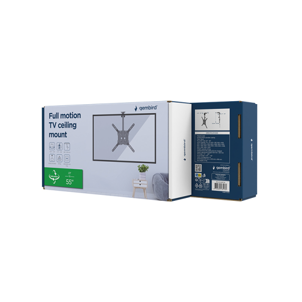 Stropni nosilec za TV s polnim gibanjem. Podpira večino LCD televizorjev od 19 do 55 palcev, združljiv z VESA, največ 400 mm x 400 mm, omogoča vrtenje in nagibanje do 90 stopinj.