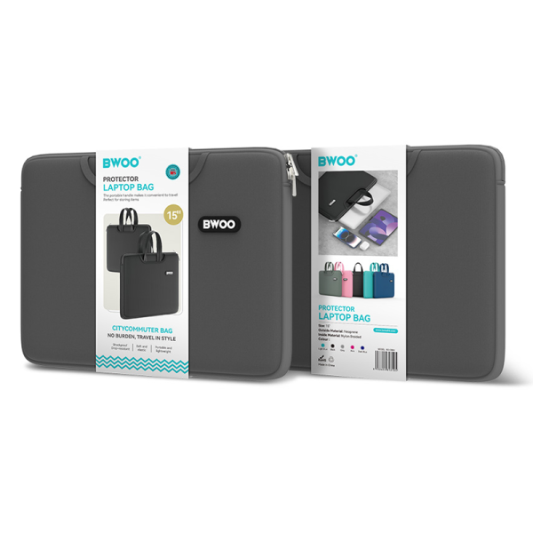 BWOO CB64BK torba za 15″ prenosnik, izdelana iz vrhunskih neoprenskih materialov, je lahka in nepremočljiva.